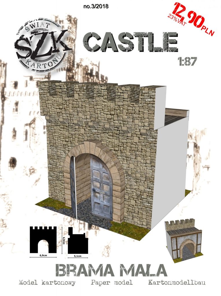 Model kartonowy średniowiecznej murowanej bramy miejskiej.