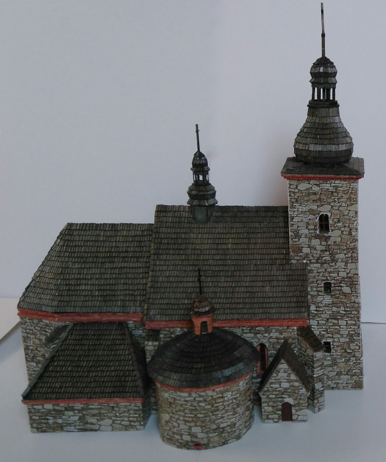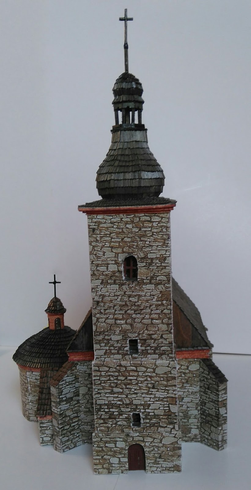 Zastanawiałem się, czy umieścić go tutaj, ponieważ wykonany jest cały z kartonu, ale dach pokryty jest gontem ze sklejki 0,4 mm. Kościółek został wybudowany w 1400 roku, a następnie przebudowany w 1707 i 1728 roku. Ja wykonałem go wg stanu z 1707 roku przed otynkowaniem go, ale już z barokowymi hełmami. Co prawda dzisiaj otynkowana jest tylko wieża i kaplica południowa, a reszta to kamienne gotyckie mury (prawdopodobnie z braku funduszy, renowacja ciągnie się latami).