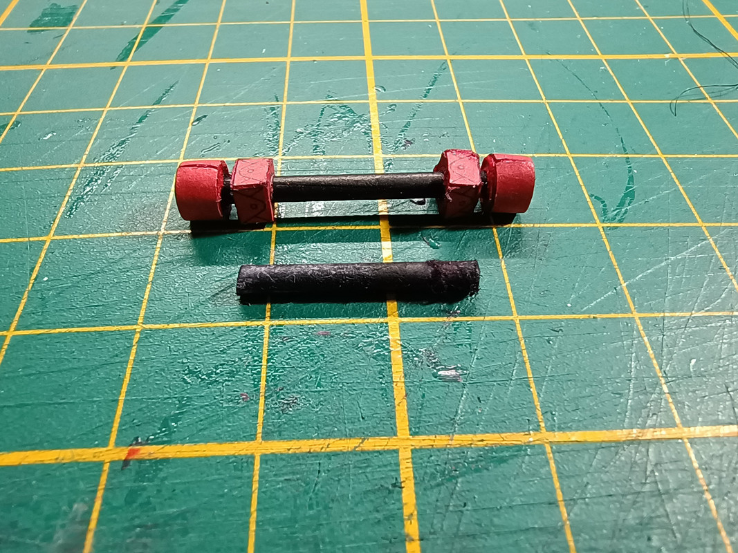 A że cały czas model stał na osiach i coraz bardziej denerwowało mnie to, że doklejanie kolejnych części ramy spowoduje wyginanie się ich przez brak miejsca od podłoża, postanowiłem zrobić koła.