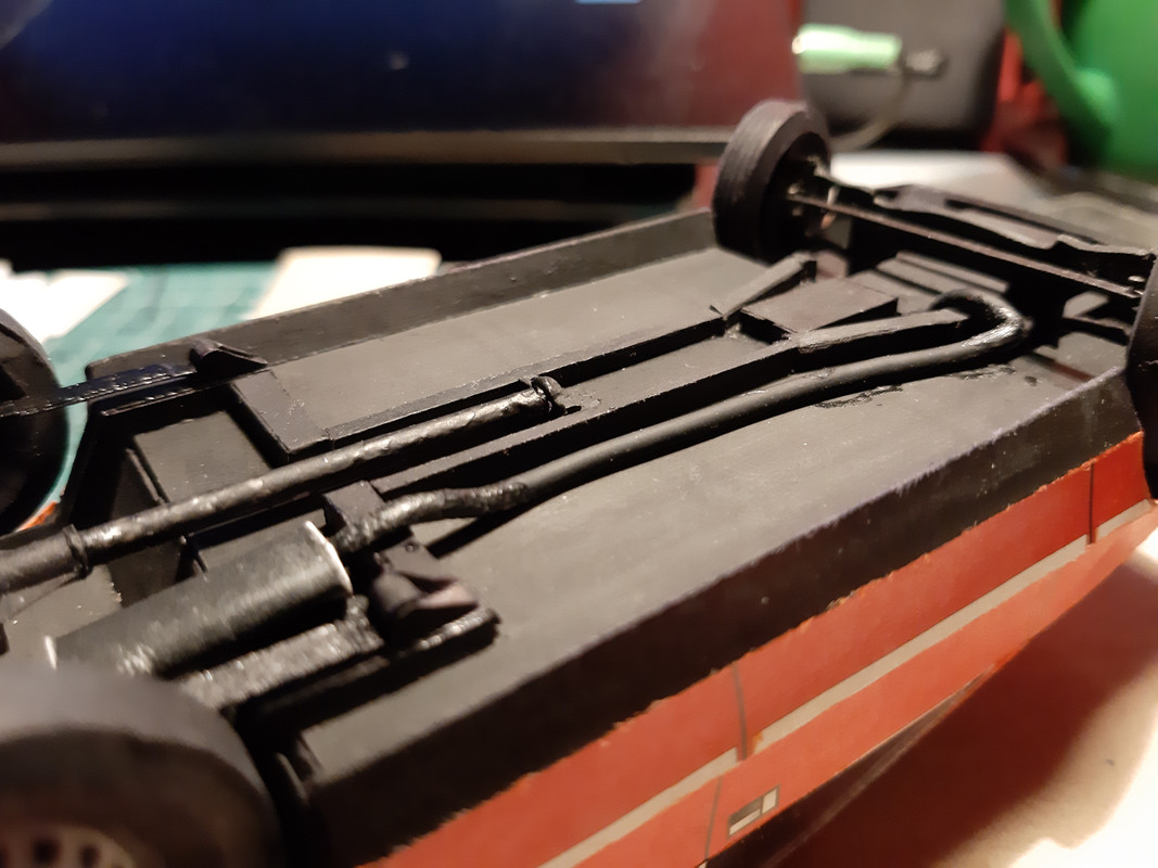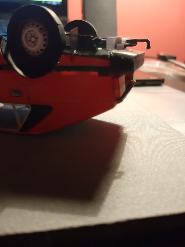 Doszło lusterko od strony kierowcy, klamki, tylne światła ( tu wyszło moje kombinowanie z ukryciem nierówności w składaniu modelu 😛 ) oraz poprawiłem też tylną wycieraczkę oraz tylne resory. Niestety, ale te drugie od ciągłego przestawiania modelu strasznie pracowały przez co praktycznie się spłaszczyły.....