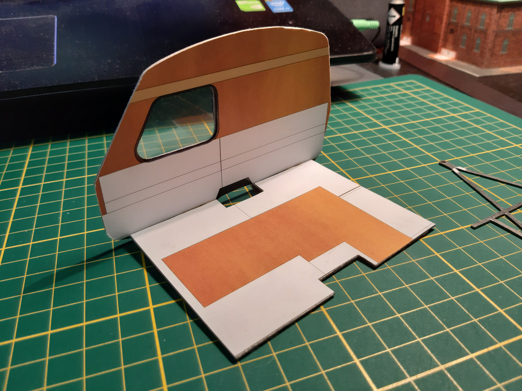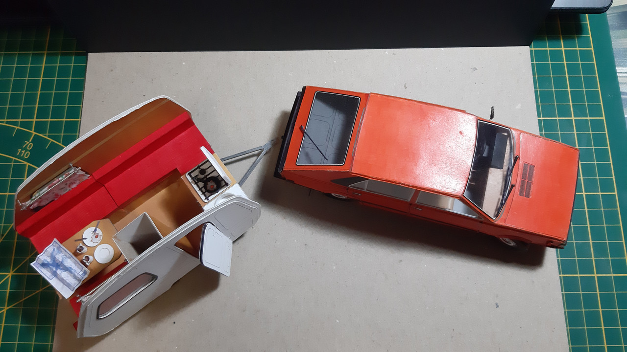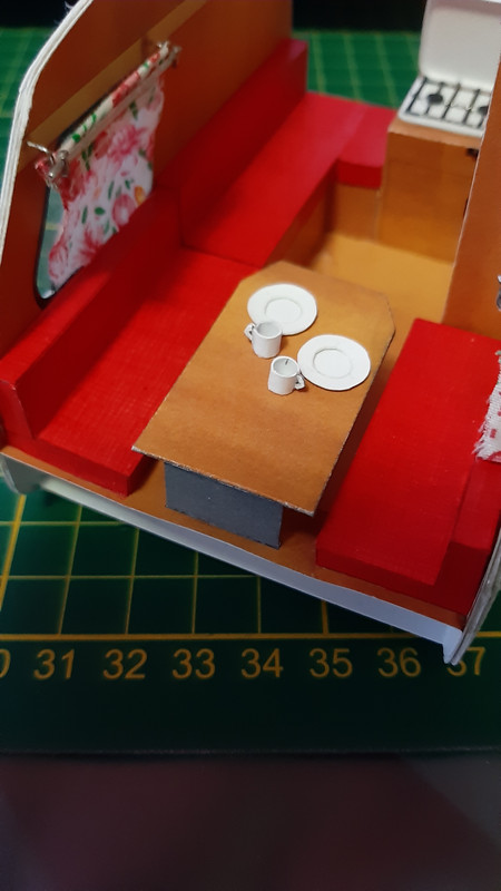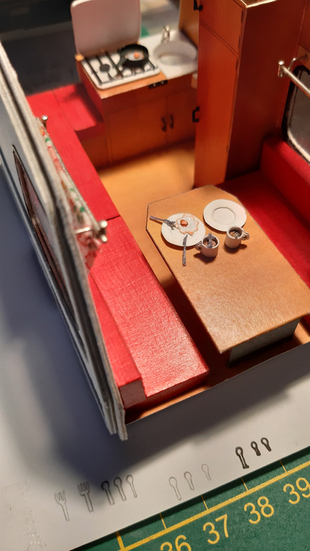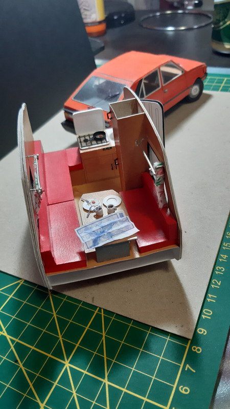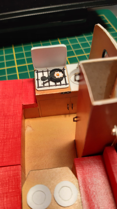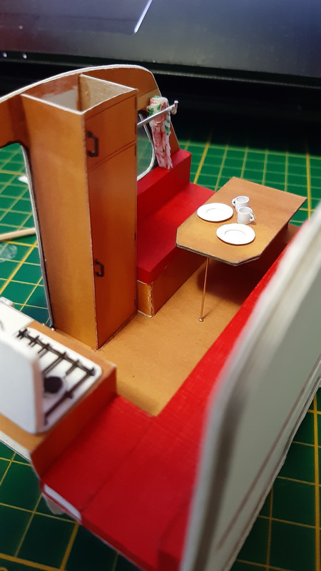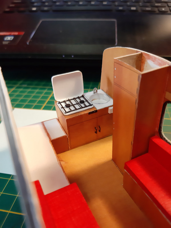 Ale wróćmy do meritum. Podstawy siedzisk już na swoim miejscu. Szafa też. Przyszedł czas na kuchnię. Bardzo raziło mnie rozwiązanie zaproponowane przez autora, które po prostu było strasznie płaskie. Ruszyła wyobraźnia i na ukończeniu najbardziej złożony element przyczepki. Na ukończeniu bo jeszcze nie wszystko jest na swoim miejscu, ale chciałem podzielić się z Wami stanem aktualnym.