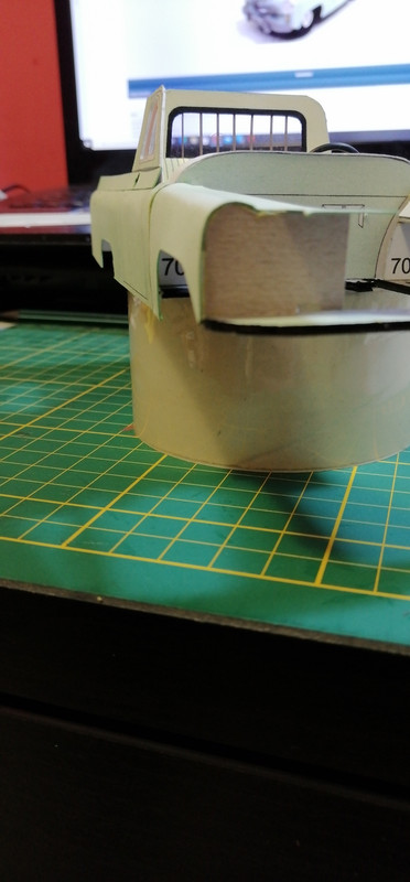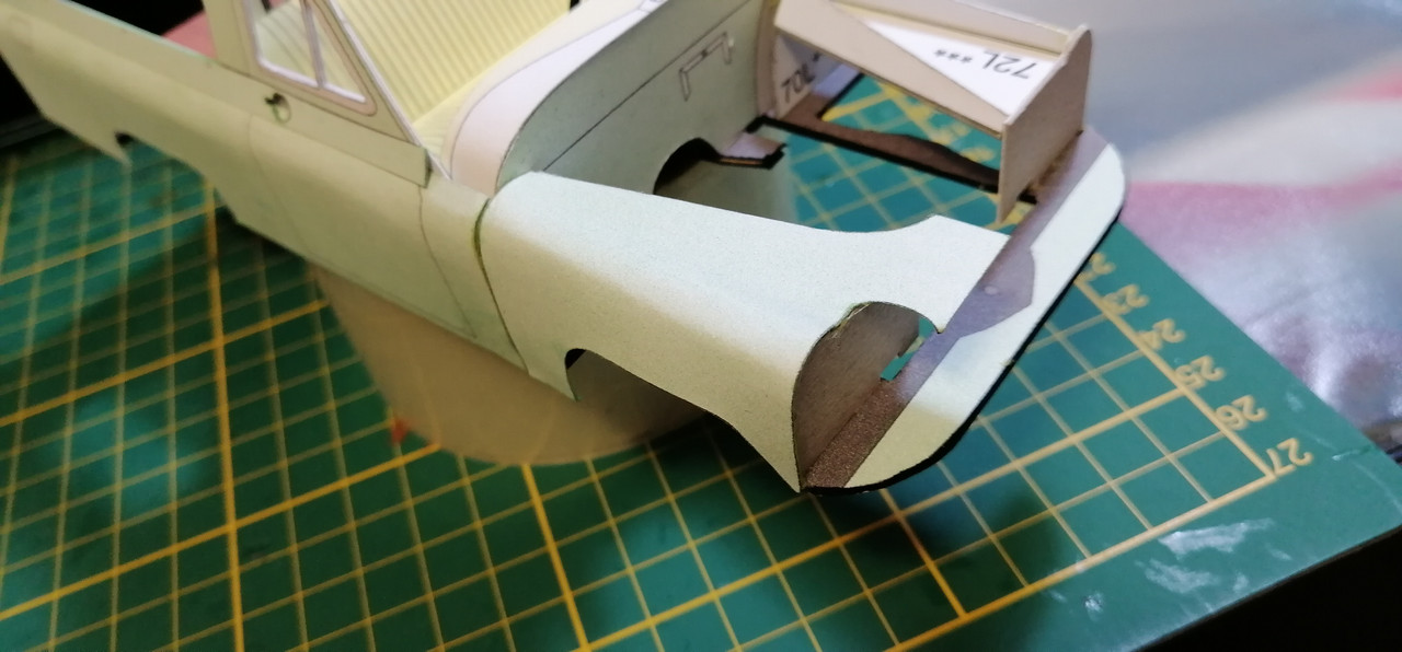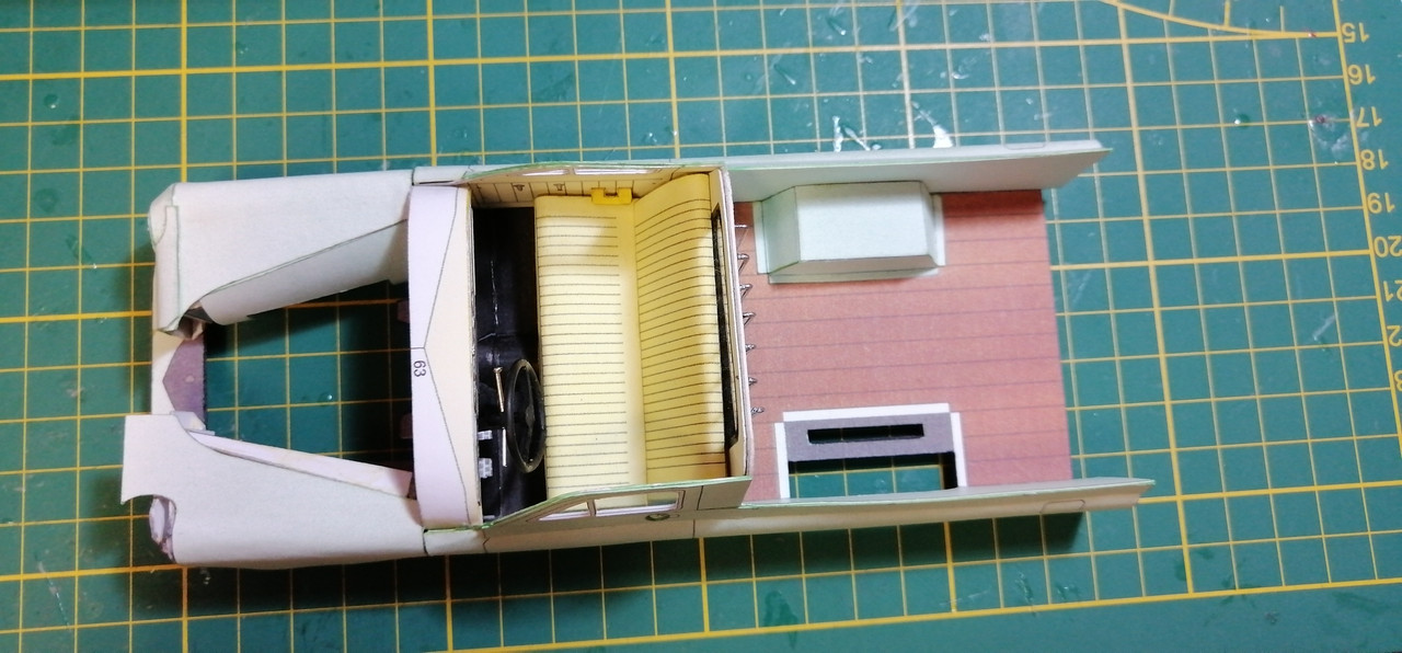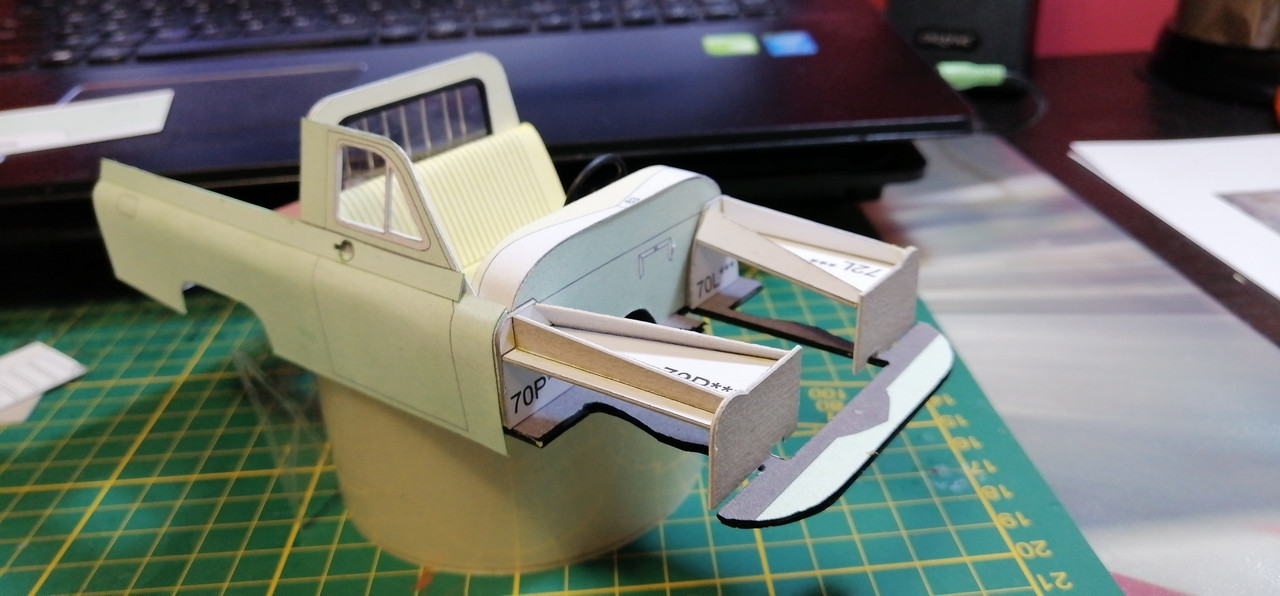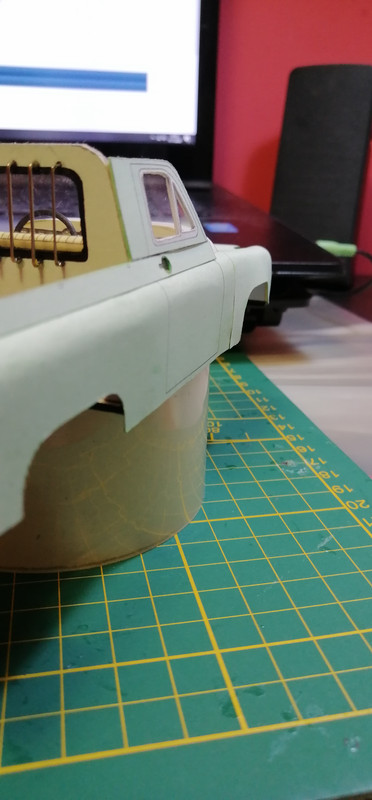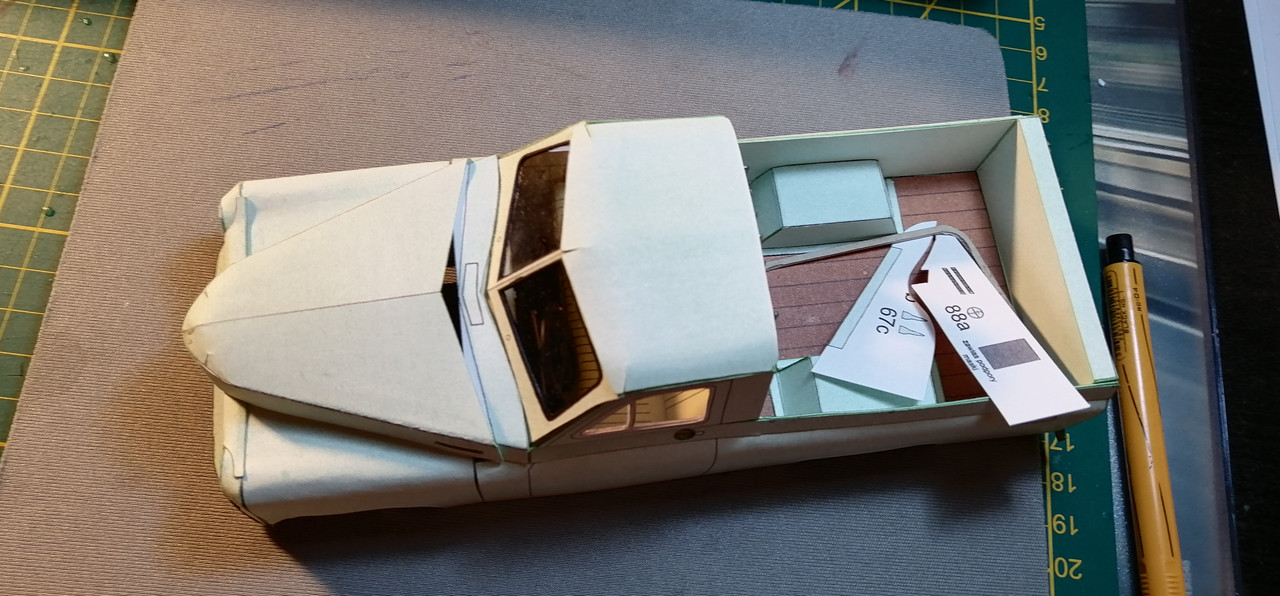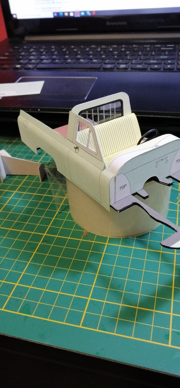 Trzeba co nie co uaktualnić wątek 🙂 Żeby kabina się nie zakurzyła trzeba było ją zamknąć co nie było łatwe. Potem wziąlem się za maskę, która również okazała się być nie lada wyzwaniem. Na uwieńczenie tego etapu prac, jako relaks złożyłem klapę skrzyni ładunkowej. Tak przygotowane nadwozie można było zacząć uzbrajać w silnik i podwozie. Nie wiem czy niespasowanie elementów to wina skanów, czy po prostu model jest tak zaprojektowany, a może to ja coś źle zrobiłem. W każdym razie trzeba było jakoś umiejętnie to wszystko schować bo przecież to wszystko widać 😉