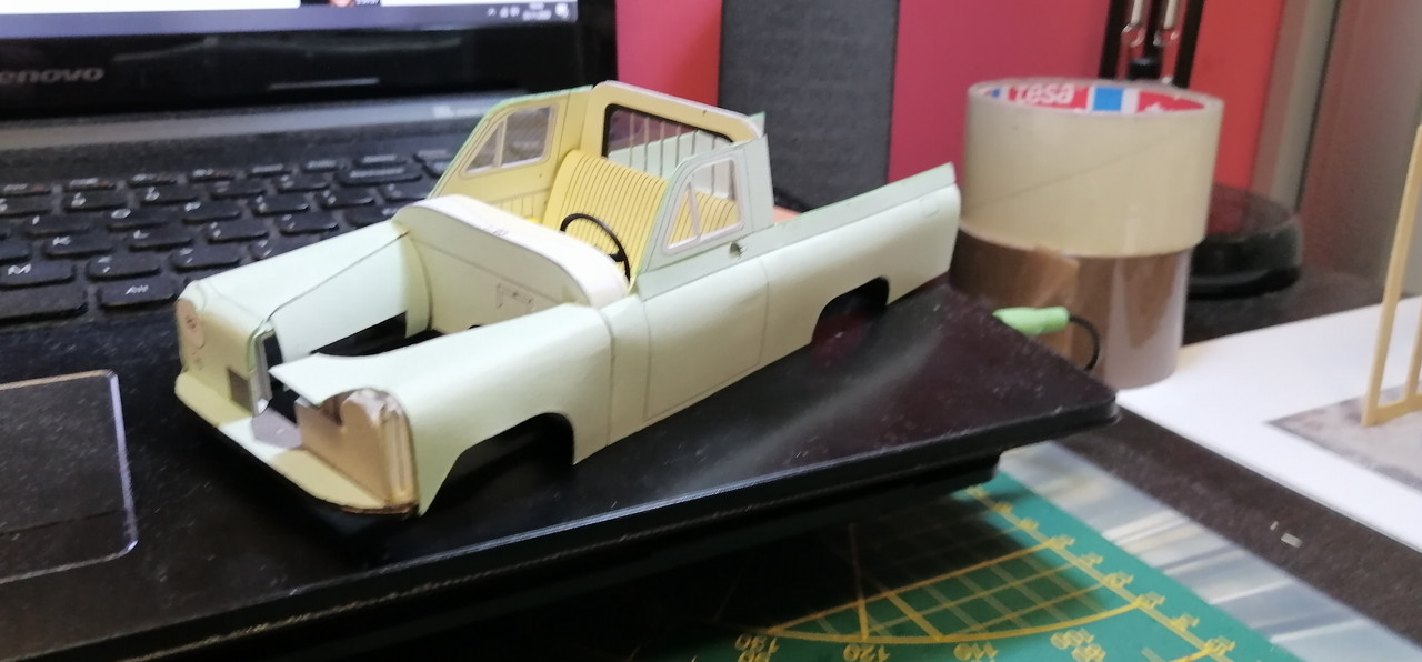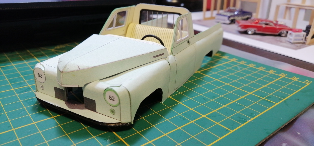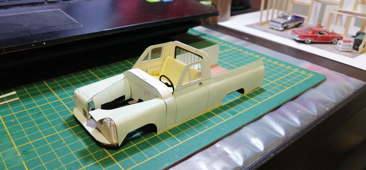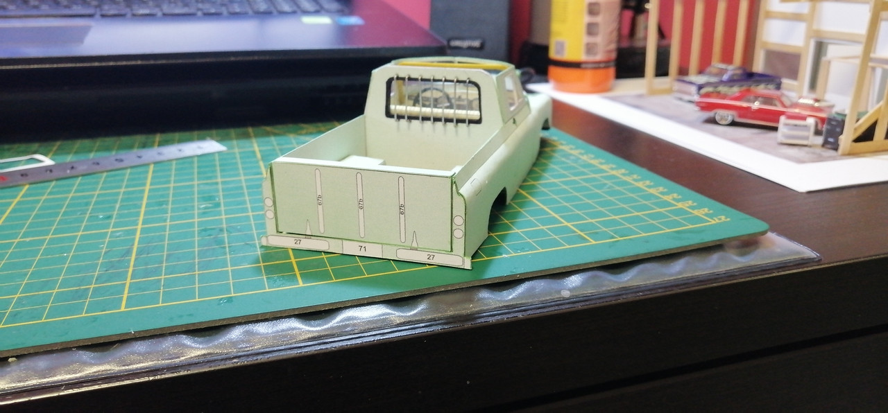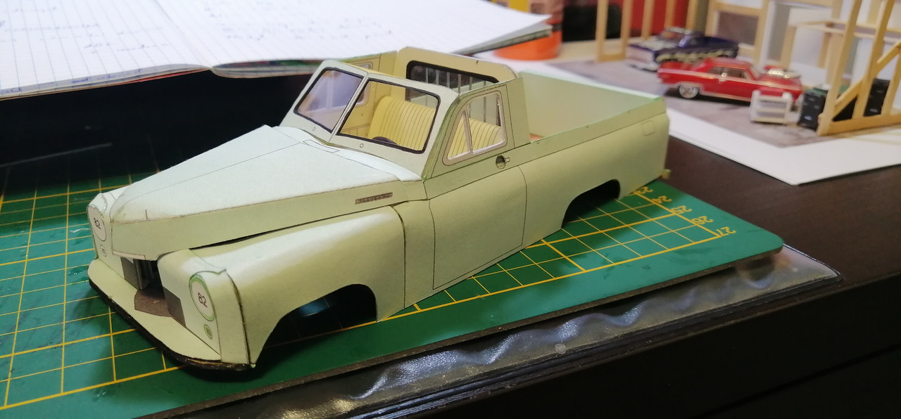 Trzeba co nie co uaktualnić wątek 🙂 Żeby kabina się nie zakurzyła trzeba było ją zamknąć co nie było łatwe. Potem wziąlem się za maskę, która również okazała się być nie lada wyzwaniem. Na uwieńczenie tego etapu prac, jako relaks złożyłem klapę skrzyni ładunkowej. Tak przygotowane nadwozie można było zacząć uzbrajać w silnik i podwozie. Nie wiem czy niespasowanie elementów to wina skanów, czy po prostu model jest tak zaprojektowany, a może to ja coś źle zrobiłem. W każdym razie trzeba było jakoś umiejętnie to wszystko schować bo przecież to wszystko widać 😉