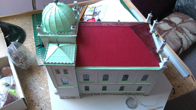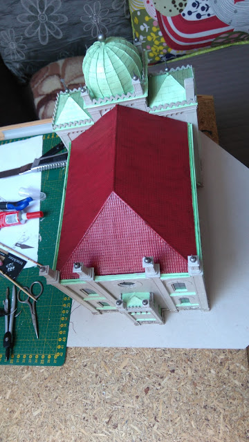 Budując makietę, dwa dachy wykonałem z formatki plastikowej. Dlatego zastanawiałem się jak wykonać je z papieru. Po kilku próbach wybrałem taki sposób. Miałem do dyspozycji tylko trzy kolory i wybrałem taki który najlepiej pasował, ale nie do końca mi się podoba.