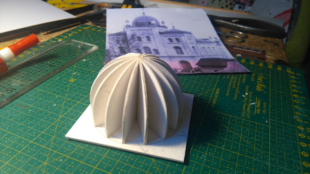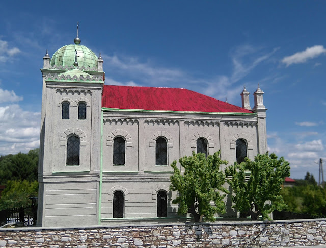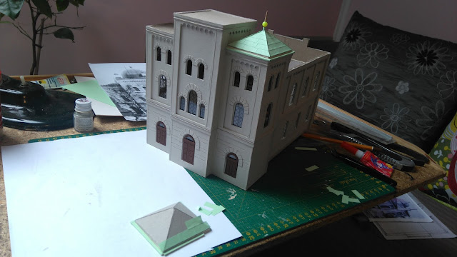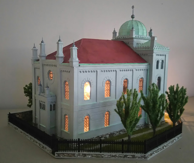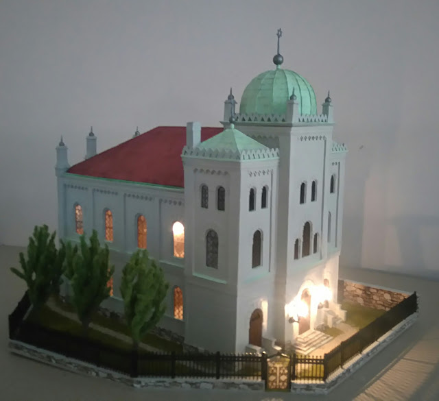 Po wykonaniu makiety myślałem, że nie będę już nic sklejał ale w Tarnowskich Górach jest jeszcze tyle ładnych budynków, że chciałem jeszcze coś skleić. Postanowiłem zrobić model nie istniejącego? budynku, znalazłem takie dwa, które kiedyś odgrywały ważną rolę a mianowicie: budynek loży masońskiej i synagogę. Synagogę spalili naziści a budynek loży masońskiej rozebrali komuniści. Znalazłem zdjęcia budynku loży masońskiej tylko z dwu stron a synagogi z 4. Wystąpiłem do Urzędu Miasta i do Miłośników Ziemi Tarnogórskiej? z zapytaniem czy nie mają jakiś materiałów - oczywiście żadnej odpowiedzi nie otrzymałem. W tym przypadku wybór był prosty- synagoga!